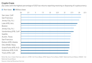 Servicemembers helped fuel a surge in crypto prices that started in the fall of 2020 and peaked in 2021. In 2020, eight of the top 25 U.S. zip codes with the highest share of tax returns reporting receiving or disposing of crypto were around military bases, according to a Wall Street Journal analysis of Internal Revenue Service data.