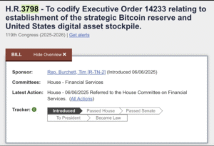 The bill also laid out a goal of accumulating 1 million Bitcoin over time, or roughly 5% of Bitcoin’s total supply, using existing US Treasury funds to acquire the Bitcoin in amounts that mirror the US Treasury’s gold allocation.