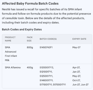 Affected Products: Specific batches of SMA infant formula and follow-on formula sold globally, including brands like Guigoz and Nidal in France, and Beba and Alfamino in Germany.